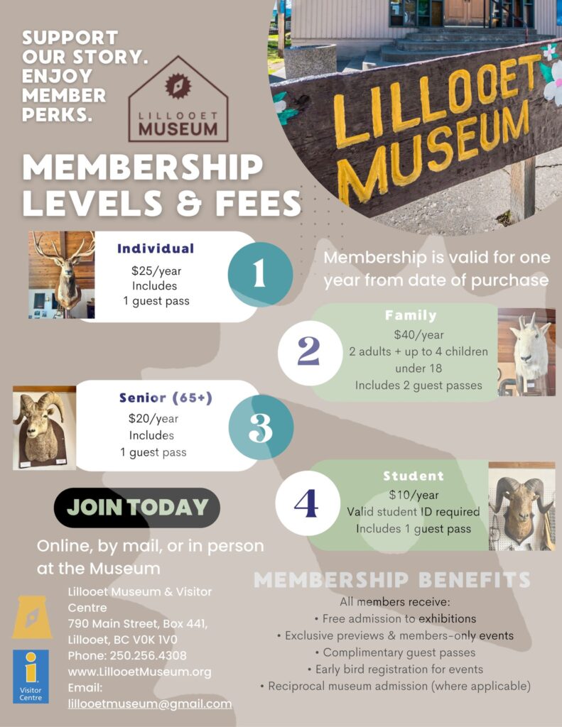 Becoming a member is one of the best ways to support our local museum. Your membership helps us preserve Lillooet’s stories, offer new exhibits, and create programs for all ages.